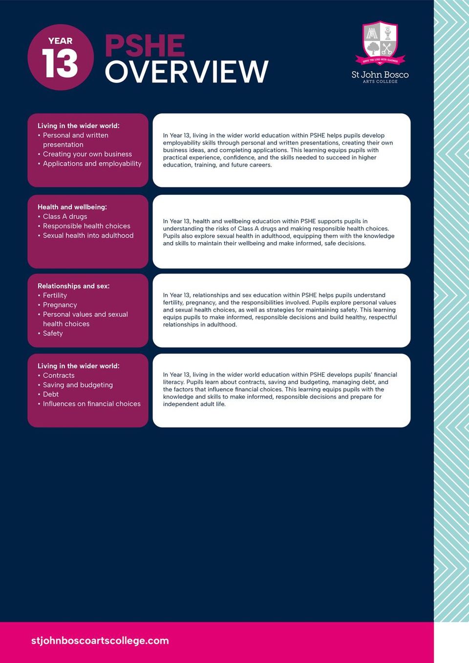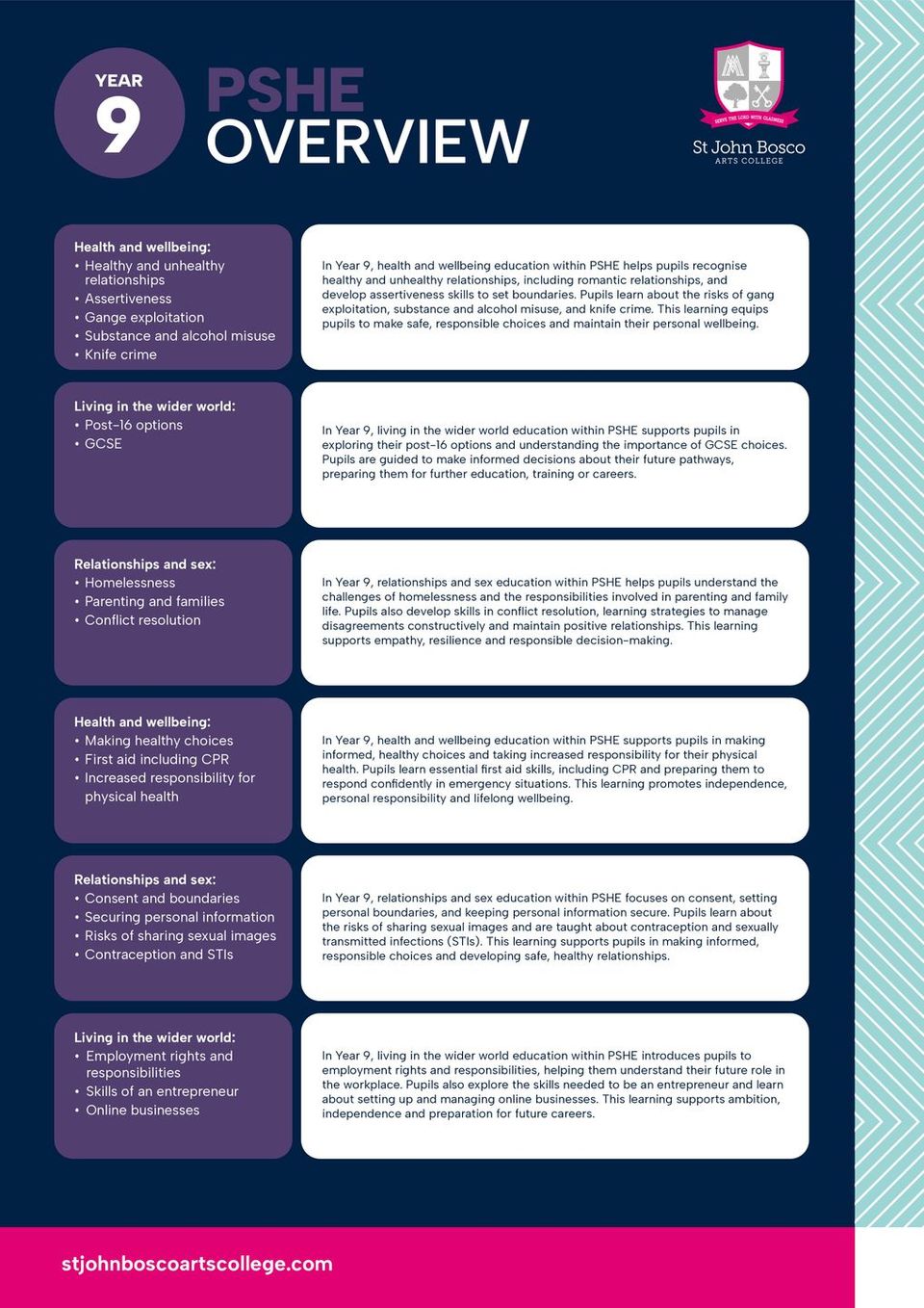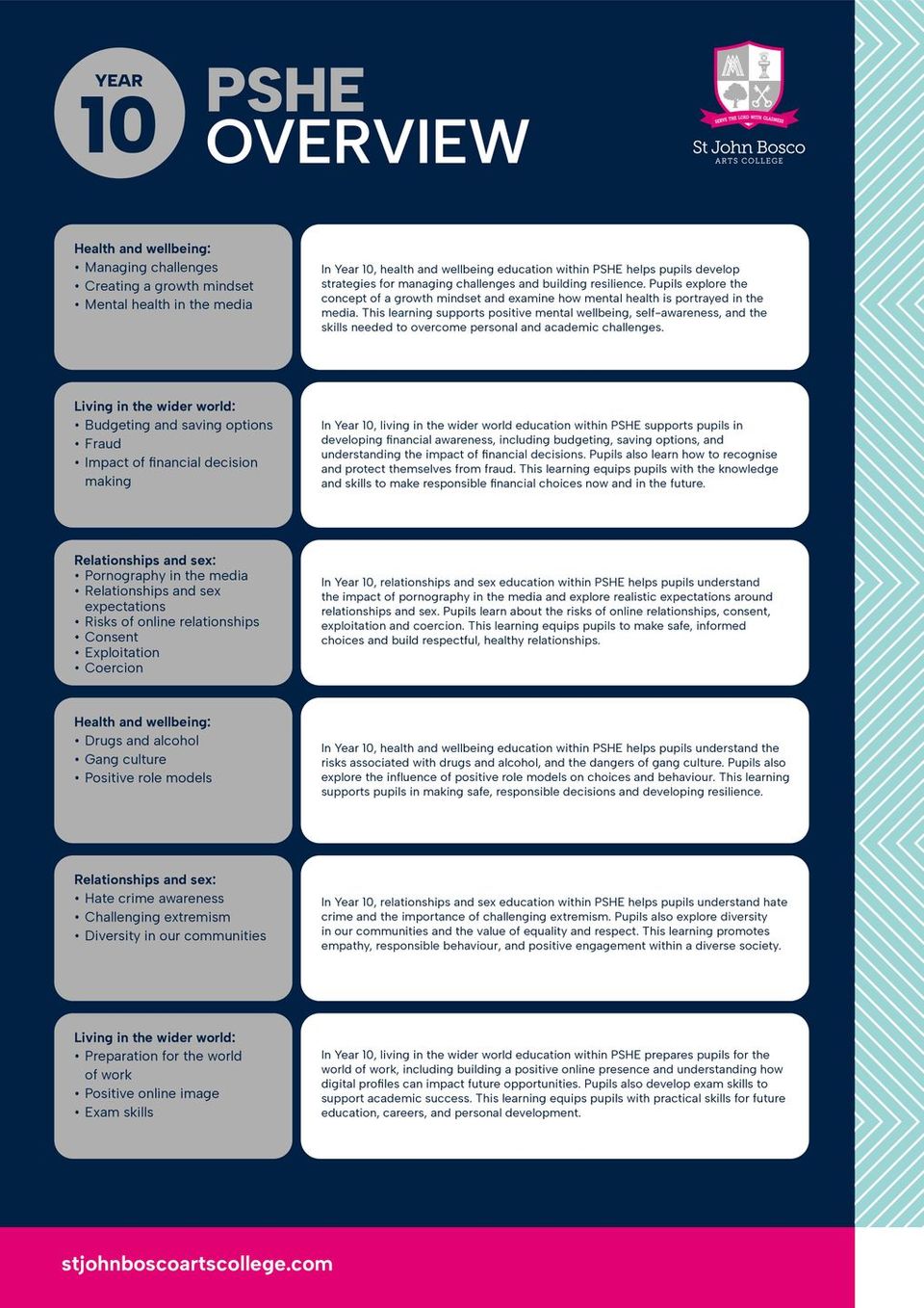 PSHE education at St John Bosco is a core element of the school’s curriculum and reflects our commitment to the holistic development of pupils, in accordance with our Catholic ethos. The programme supports pupils’ personal, social, moral and emotional development, enabling them to become responsible, respectful and informed members of society.