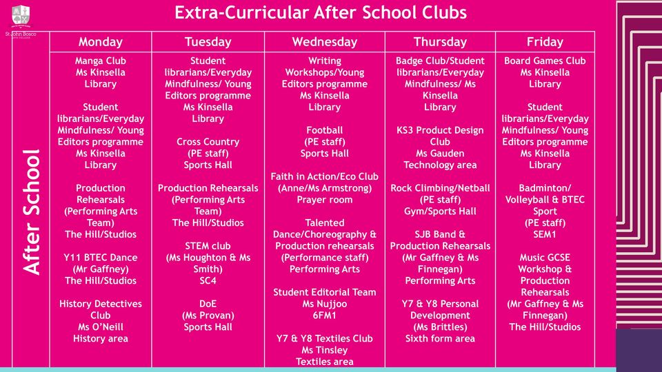At St John Bosco Arts College we have an exciting timetable of extra-curricular activities to offer ALL students. The extra-curricular offer complements the taught curriculum, and goes further in enriching the school experience, allowing students to try new things, expand their knowledge and share in new experiences with others.