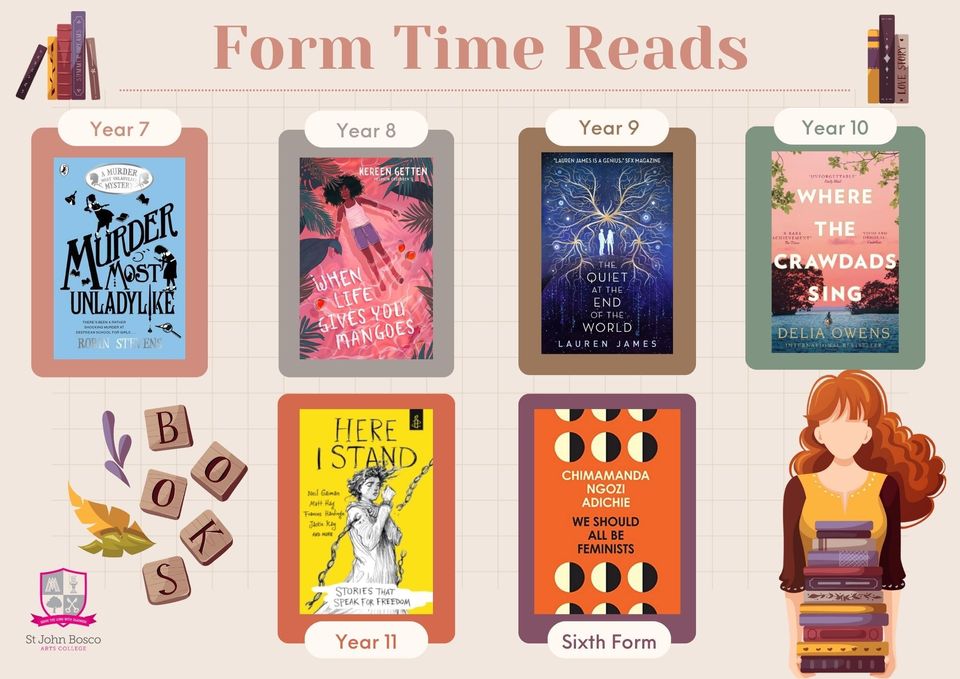 Did you know that each student experiences being read aloud to by their form tutors during registration in the morning? You can find out more information about Form Time Literacy here and you can view which book each year group are reading this term below; (click on the book covers to find out more information about each book)