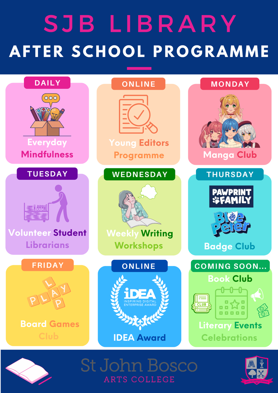 The library has a vibrant programme of extracurricular activities on offer for students to access on a daily, weekly and termly basis, as well as regular competitions and hosting a variety of literary event celebrations throughout the academic calendar (to keep up to date, details are posted regularly on ClassCharts, Microsoft Teams and on socials). Please click on the 'After School Programme' image for more information about the weekly library activities available in the library.