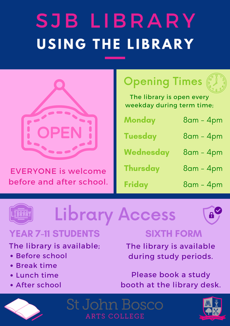 Everyone is welcome before and after school. Year 7-11 students can use the library at break and lunch times. Sixth Form students - study booths are available (from Monday to Friday) to book for study periods at the Library Helpdesk on a first come first served basis.